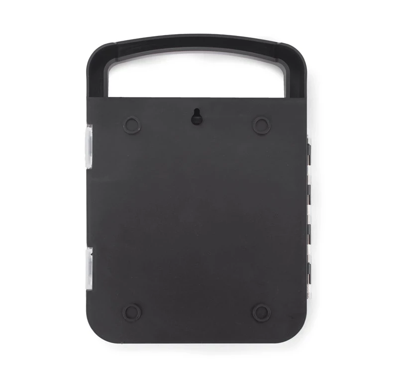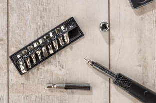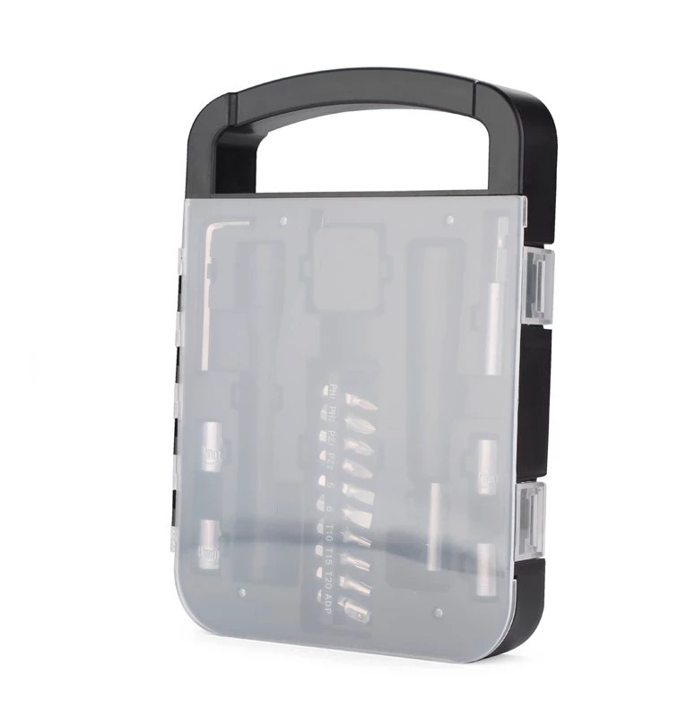 Wewnątrz znajdują się: klucz imbusowy, latarka, miara, wkrętak, dziesięć różnych bitów, przedłużka i cztery końcówki nasadowe 7mm, 8mm, 9mm i 10mm.